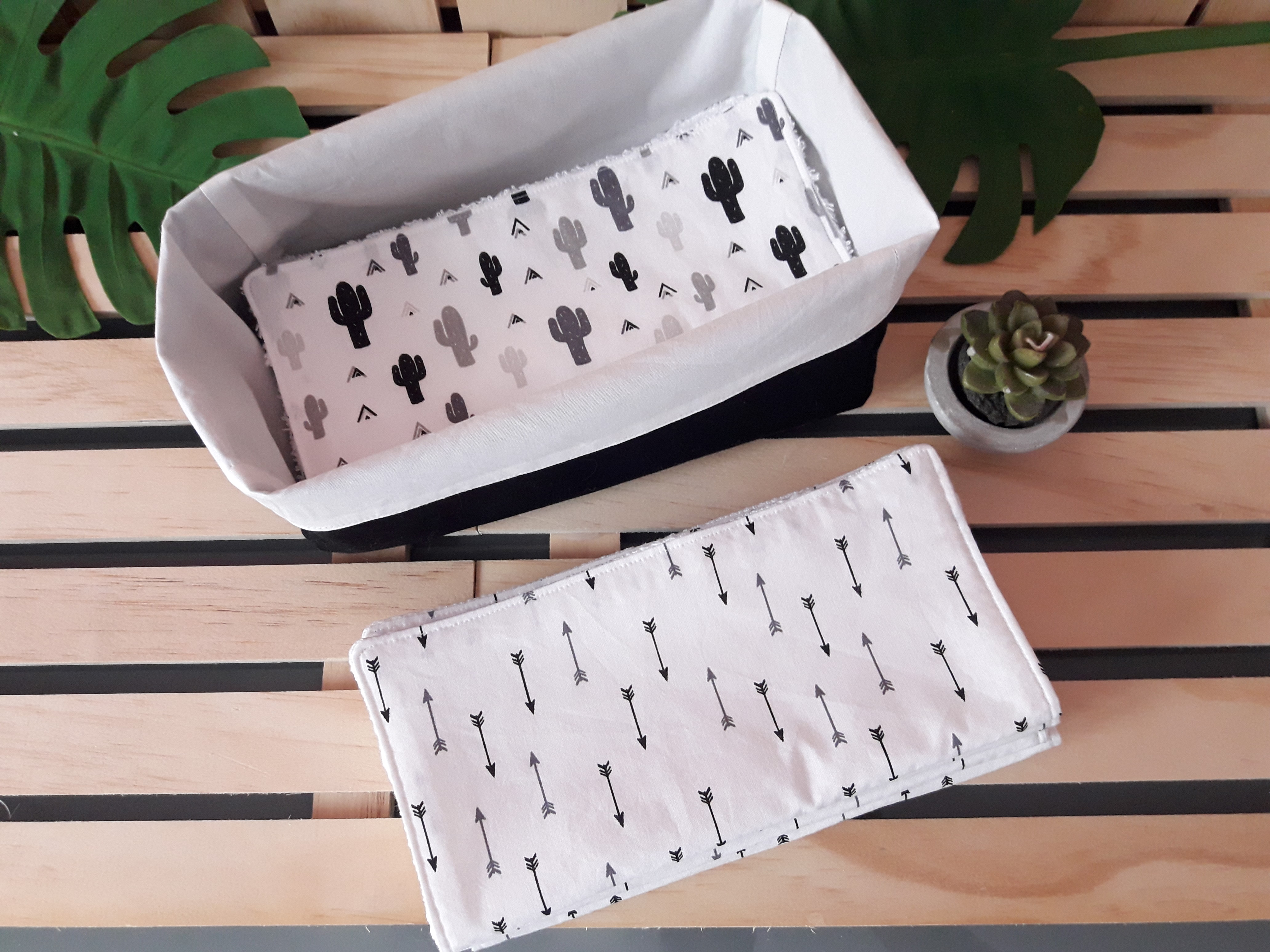 et 5 essuie-tout éponge bio avec une face coton assorti à la panière.